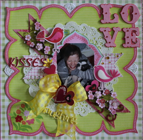 OMG!!! but this page took forever. I kept wanting to put flowers in place of the bow but the page folded its papers put on a pouty face and said "No". I looked to the side of the table and found this cloth bow and asked, " well what about this?" "Yes please, that will do nicely." Also, there is also fabric under the cherry blossoms that has embroidery stitching. Journaling for this layout is found on the back this time. (Katie and Eloise share a happy reunion) So I present to you Love &Kisses.